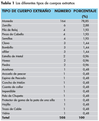Se han reportado la ingestión de una gran variedad de cuerpos extraños como: monedas, partes de juguetes, canicas, alfileres, tachuelas, y semillas, menos frecuentes los huesos de pollo y espinas de pescado.13 Stevens en una serie de 139 niños con ingesta de cuerpos extraños observó que los más recuentes eran las monedas, hallazgo corroborado en nuestro informe donde 78,85% de los pacientes tenían este objeto.5