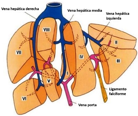 Los segmentos se enumeran en el sentido de las agujas del reloj. Los segmentos II, III y IV, conocidos como segmento anterior, posterior y medial del lóbulo izquierdo. A su vez, el lóbulo derecho está formado por los segmentos V y VIII (segmentos anteriores) y los segmentos VI y VII (segmentos posteriores). El segmento I, o lóbulo caudado, se encuentra en la parte posterior. Se identifica como una prominencia en sus superficies inferior y posterior, constando de tres partes: el lóbulo de Spiegel, el proceso caudado y la parte paracava delante de la VCI (Figura 1).
