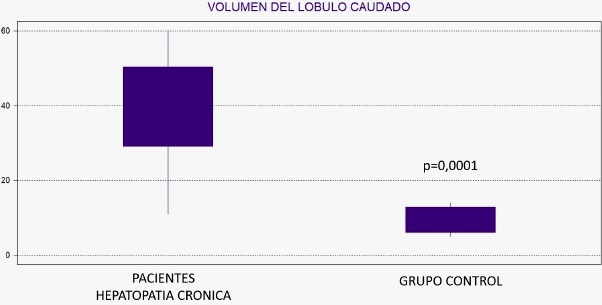 Se compararon el volumen del lóbulo caudado de los pacientes con EHC con el grupo control.