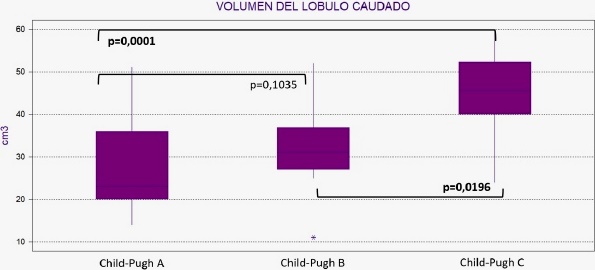 Figura 4 Comparación del volumen del lóbulo caudado de pacientes cirróticos de acuerdo con el Child-Pugh