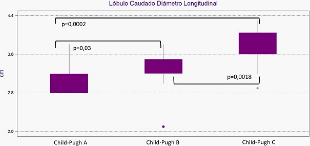 Figura 5 Comparación del diámetro longitudinal del lóbulo caudado de pacientes cirróticos de acuerdo con el Child-Pugh