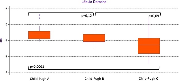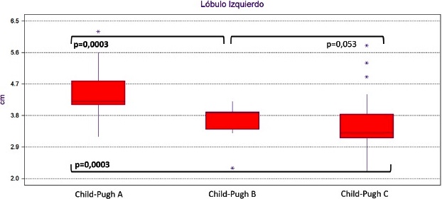 Figura 6 Comparación del diámetro del lóbulo izquierdo de pacientes cirróticos de acuerdo con el Child-Pugh
