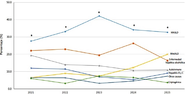 *p<0,01. MASLD: siglas en inglés Metabolic dysfunction-associated Steatotic Liver Disease. MetALD, siglas en inglés, MetALD, Metabolic dysfunction-associated Steatohepatitis and Alcohol-related Liver Disease. Causas autoimmune (hepatitis autoinmune, colangitis esclerosante primaria, cirrosis biliar primaria y síndrome de superposición)
