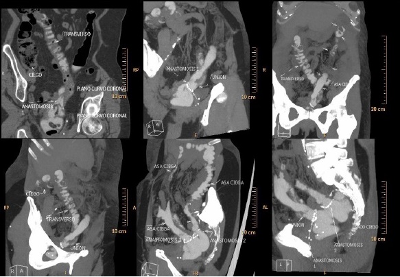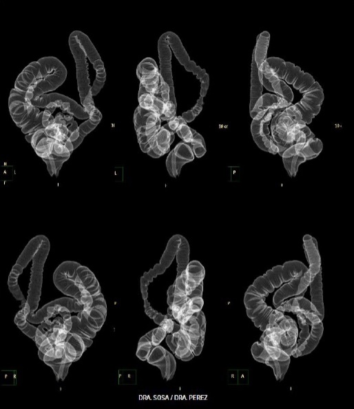 Figura 1 Caso1: imágenes tomográficas multiplanares del colon a partir de las cuales se realizó el PPIT. Se observan varias anastomosis entre los segmentos colónicos, la disposición excepcional del colon transverso y áreas con aspecto de asas ciegas en zonas del colon y del recto