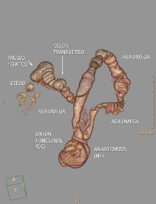 Figura 2 Caso 1: vista anterior de PPIT. Se observan cambios posquirúrgicos y se identifica el ciego, ángulo hepático y segmento proximal del colon transverso y la unión de naturaleza funcional (unión C-C) entre este segmento y el recto medio; adicionalmente, se observa segmento colónico en “asa omega” constituido por el segmento distal del colon transverso, el ángulo esplénico y el colon descendente que se une al recto mediante anastomosis no funcional (N-F)