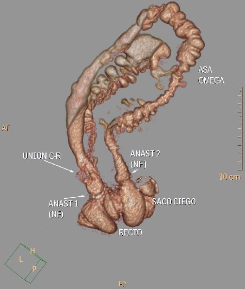 Figura 3 Caso 1: vista lateral de PPIT: se aprecian cambios posquirúrgicos en los que se observan la unión funcional del segmento colónico que proviene del colon proximal (unión C-C), dos anastomosis no funcionales (NF) correspondientes al “ asa omega” colónica y un saco ciego que corresponde al recto.