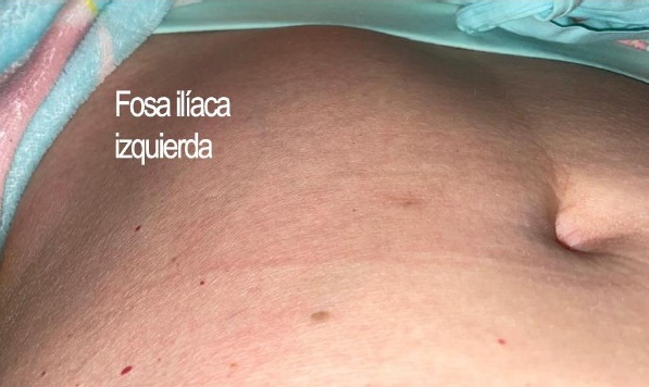 Figura 4 Caso 2: fotografía proporcionada por la paciente mientras se encuentra en decúbito supino. Se observa la tumoración que se localiza en fosa iliaca izquierda.