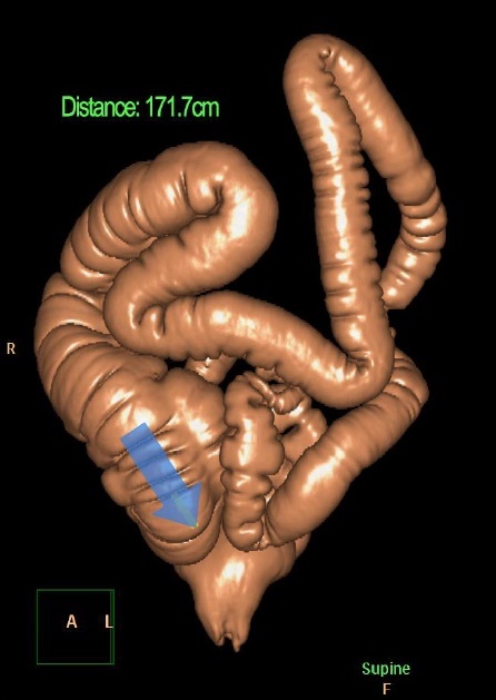 Una vez que se evaluó la paciente en consulta preoperatoria y ante la duda diagnostica, se realizó tomografía de abdomen/pelvis y protocolo de colonoscopia virtual con PPIT en el que se observó colon extremadamente redundante, con longitud aproximada de 171.7 cm (Figura 5), presencia de 12 curvas en su trayecto y finalmente, se confirmó la ausencia de divertículo gigante en el sigmoide (Figura 6, 7, 8A y 8B).
