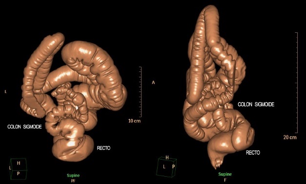 Figura 7 Caso 2: imágenes volumétricas del colon desde diferentes perspectivas. Se observa la extrema redundancia del colon en cada una de las partes, desde el colon ascendente hasta el sigmoides.