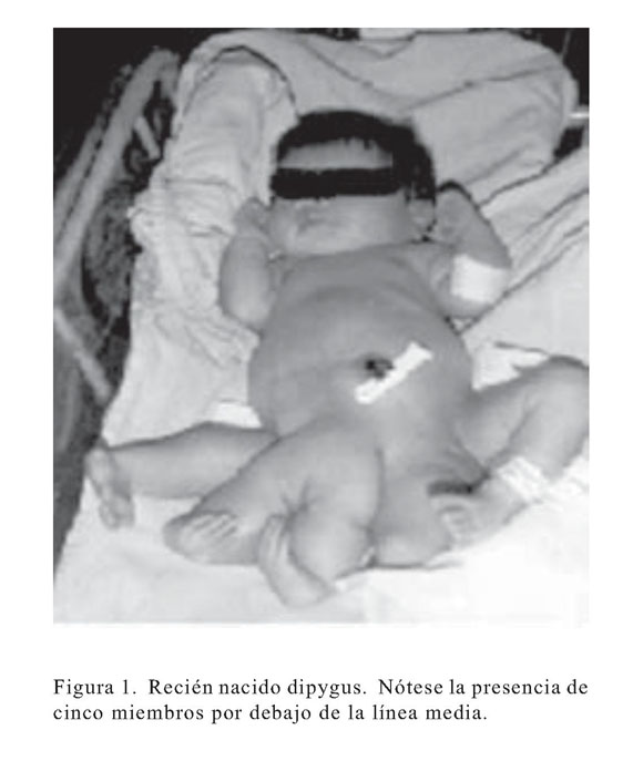 Se reporta caso de paciente de 31 anos de edad (II gesta, 1 para), con embarazo no controlado, quien acude a la emergencia del Departamento Obstétrico del Hospital Universitario de Maracaibo, Maternidad Dr. Armando Castillo Plaza ", con embarazo de 40 semanas, presentación podálicay trabajo departo. Se realiza cesárea segmentaria, obteniéndose recién nacido vivo,femenino. Peso: 4 200 g, Talla: 53 cm. El examen físico mostró anomalías múltiples en cintura pélvica caracterizadas por duplicación de miembros inferiores, articulados en número de 3. Actualmente se encuentra en condiciones clínicas estables. Se le realizó desarticulación de los miembros adicionales y se encuentra en espera de estudios complementarios afin de elaborar una prótesisfuncional para su caso.