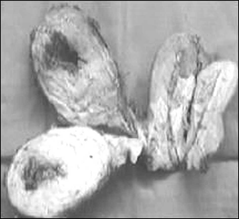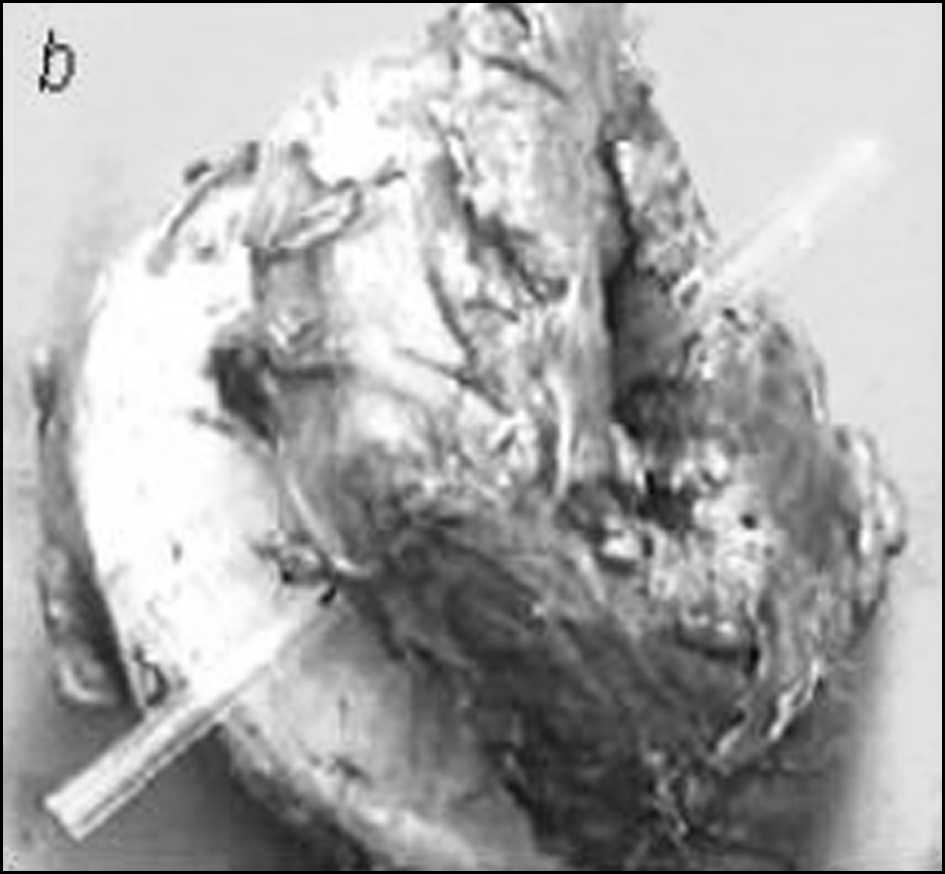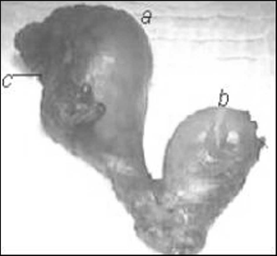 c) Útero doble: hemicuerpo derecho de 20 cm x 10 cm con solución de continuidad total en su cara posterior (orificio de 7 cm diámetro), sin sangrado activo. Hemicuerpo uterino izquierdo de 7 cm x 5 cm, sin alteraciones macroscópicas evidentes (Figuras 1, 2 y 3), cada hemicuerpo uterino con su respectiva trompa y ovario.