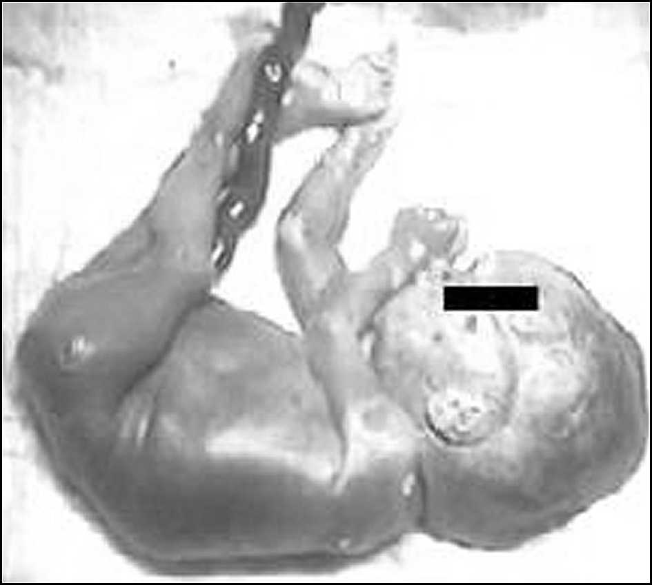 d) Saco amniótico indemne, libre en cavidad abdominal, conteniendo líquido amniótico vinoso y óbito fetal masculino, con datos de maculación (Figura 4).