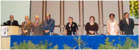 Figura 1. Presidium de la Ceremonia Inaugural. De izquierda a derecha, Drs. Rogelio Pérez DGregorio, Luis Távara, Gustavo Pinedo Nava, José Enrique López, Fanny Fleitas, Trina Navas, Judith Toro Merlo y Alfonso Arias.