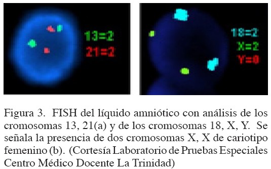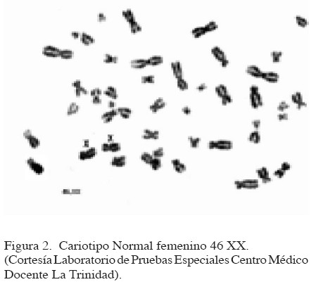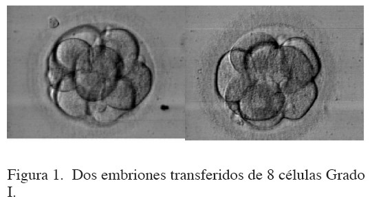 Se administraron 10 000 UI (IM) de gonadotropina coriónica humana (hCG), cuando el folículo dominante alcanzó 18-20 mm de diámetro. Se recuperaron 11 ovocitos bajo la guía de US luego de 36 horas de la administración de hCG. La técnica de reproducción asistida utilizada fue la inyección intracitoplasmática de espermatozoides. Los ovocitos Metafase II fueron diagnosticados luego del tratamiento con hialuronidasa y la observación del cuerpo polar según la clasificación de Veek (7), inyectándose con los espermatozoides descongelados sexados, 9 ovocitos maduros. Se transfirieron dos embriones grado I de 8 células al útero de la paciente (Figura 1). Se administró progesterona IM para soporte lúteo hasta la prueba de embarazo. El embarazo clínico fue diagnosticado por la presencia de un saco gestacional. Se realizó amniocentesis y FISH confirmándose el cariotipo normal femenino (Figura 2 y 3). A las 38 semanas de gestación se realizó una cesárea con el nacimiento de una niña normal de peso 3,050 kg y talla 48 cm.