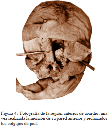 En la región ventral, por debajo del cuero cabelludo, los rasgos faciales están representados por una estructura tubular, que semeja una probóscide e inmediatamente caudal a la misma se aprecian dos pliegues, uno superior y otro inferior, que parecen corresponder a estructuras labiales rudimentarias, estos pliegues delimitan una pequeña abertura que posiblemente corresponde a la cavidad bucal. Hacia los lados de la probóscide se observan dos pliegues transversales, que semejan las hendiduras palpebrales. En las partes laterales de la región cefálica no se observa ningún esbozo de los pabellones auriculares (Figura 2).