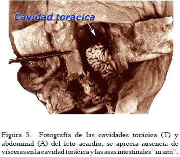 Al realizar la incisión de la pared anterior del feto, se observa un tejido mucoide, bastante grueso, de aspecto gelatinoso, con escasos fascículos musculares. Su estudio microscópico permite apreciar una epidermis con abundantes células vacuolizadas y la dermis presenta un marcado edema, lo cual le da un aspecto mixedematoso. Sus células son estrelladas, similares a las del tejido mesenquimatoso. Además se observan abundantes vasos sanguíneos telangiactásicos (Figura 3). La cavidad torácica es muy pequeña y está completamente vacía, sin desarrollo de corazón y pulmones (Figura 4).