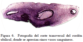A nivel de la cicatriz umbilical se lograron disecar cinco vasos sanguíneos, dos vasos superiores, que probablemente corresponden a las venas umbilicales y los tres vasos sanguíneos inferiores se disponen en forma de abanico, los cuales posiblemente corresponden a las arterias umbilicales (Figura 6).