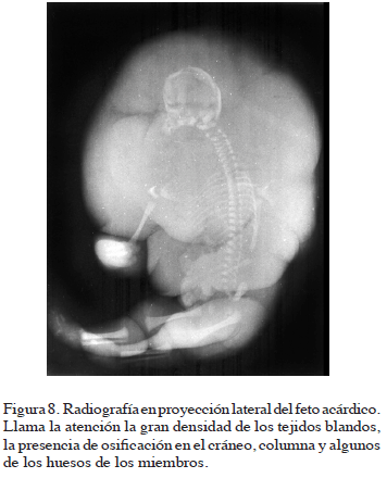 La radiografía lateral permite la visualización de un cráneo muy pequeño. La base del cráneo presenta gran alteración en su desarrollo, razón por la cual no pueden diferenciarse sus componentes. El viscerocráneo tiene una osificación deficiente (Figura 8).