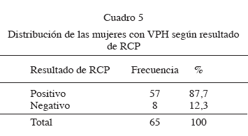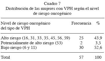 in situ o invasor.El 87,7 % de las 65 pacientes a las que se les practicó RCP tuvieron la prueba positiva (Cuadro 5), con predominio estadísticamente significativo (Z = 8,42; P = 0,000). Entre las 57 mujeres con RCP positivo, el tipo de VPH más frecuente fue el 6 con 31,6 % (Cuadro 6) y en el 43,9 % se detectó presencia de tipos de VPH de alto riesgo oncogénico (16, 31, 33, 35, 45, 56, 59), como se aprecia en el Cuadro 7. La prevalencia de virus de bajo riesgo (52,6 %) no fue estadísticamente mayor que la de los tipos de VPH de alto riesgo (43,9 %) entre las pacientes estudiadas, (Z = 0,37 y P = 0,354).