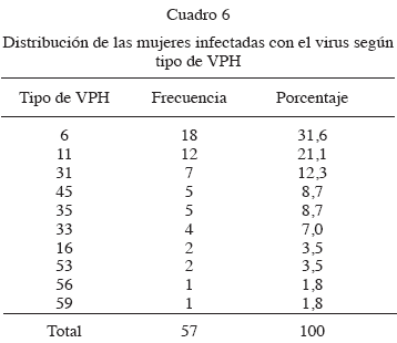 Respecto al tipo de VPH encontrado con más frecuencia, más de la mitad de los casos tuvieron los tipos 6 y 11, lo cual contrasta con el predominio de los tipos 16 y 18 conseguido en una