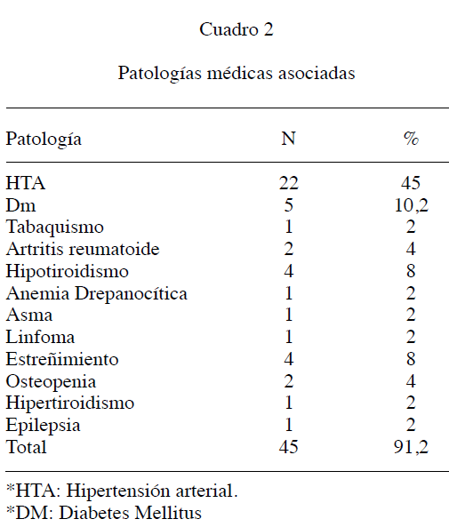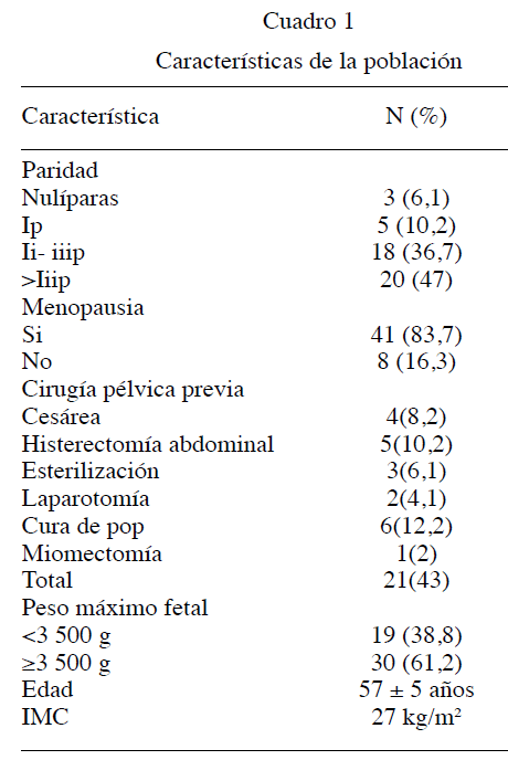 La población en estudio estuvo constituida por 51 pacientes, de las cuales se excluyeron 2 por historia clínica incompleta. La edad promedio fue de 57 ± 5 años. El índice de masa corporal promedio fue de 27 kg/m2, con 39 % de sobrepeso en la población estudiada (Cuadro 1). El 82,6 % de las pacientes tenían 2 o más partos vaginales. La patología médica asociada más observada fue la hipertensión arterial (HTA) con 45.%, seguida de la diabetes mellitus y el hipotiroidismo, con 10,2 y 8 % respectivamente (Cuadro 2). El 83,7.% de las pacientes eran posmenopáusicas. El 60,9 % de la población presentaba un peso máximo fetal mayor o igual a 3 500 g (Cuadro 1).