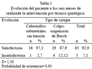 Al evaluar la evolución de las curas de incontinencia urinaria a los seis meses posteriores a la intervención, se encontró que la proporción de evoluciones satisfactorias en los casos en que se utilizaron cabestrillos suburetrales sin tensión fue de 97,3 % mientras que en los casos en los que se utilizó la técnica de colposuspensión Burch la proporción fue de 87,9 % (Tabla 1).