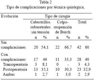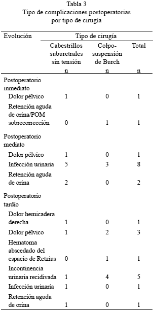 Las complicaciones postoperatorias que se presentaron con mayor frecuencia en las pacientes tratadas con cabestrillos suburetrales sin tensión fueron infección urinaria, 6 casos (5 en el postoperatorio mediato (POM) y 1 en el postoperatorio tardío (POT)) y retención aguda de orina, 3 casos (2 en el POM y 1 en el POT), mientras que en las pacientes tratadas con la técnica colposuspensión de Burch las complicaciones más frecuentes fueron incontinencia urinaria recidivada, 4 casos (POT), infección urinaria, 3 casos (POM), y dolor pélvico, 2 casos (POT) (Tabla 3).