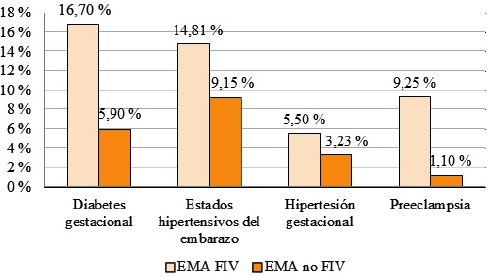 No se encontraron diferencias en la prevalencia de diabetes pregestacional o hipertensión arterial crónica entre ambos grupos. En el gráfico 1 se observa que la DG fue significativamente más frecuente en las mujeres con EMA y FIV (16,7 % vs. 5,9 %; p = 0,023). El riesgo relativo que confiere la FIV para el diagnóstico de DG fue de 2,83 (IC 95 %: 1,19 - 6,77). La significación estadística se mantuvo al eliminar la obesidad como posible factor de confusión. No se observaron diferencias significativas en la necesidad de insulinoterapia para el control glucémico. Los estados hipertensivos del embarazo se diagnosticaron con mayor frecuencia en los casos (14,81 % vs. 9,15 %),sin alcanzar significación estadística (p = 0,361). Resultados similares se obtuvieron al estudiar la hipertensión gestacional (p = 0,432) y la preeclampsia (p = 0,286).