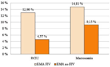 EMA-FIV: edad materna avanzada - fertilización in vitro; EMA-noFIV: edad materna avanzada y embarazo espontáneo; RCIU: restricción de crecimiento intrauterino