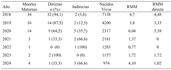 Durante el periodo en estudio (2018-2024) se registró un total de 74 MM; la razón de mortalidad materna (RMM) para el 2018 fue de 4,48; evidenciando un descenso de la tasa a 1,02 en 2024. Esta tasa es obtenida a través de la relación de MM sobre los nacimientos vivos registrados (NVR) por 1000 (Tabla 1), observándose una disminución sostenida de este indicador durante los años de la intervención, con una reducción interanual de la MM de 88,22 % y de la MM directa de 96,87 %.