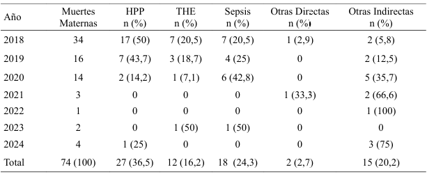 La principal causa de MM durante el periodo 2018 2024 fue la HPP, representando el 36,5 % de las muertes registradas, seguido por sepsis con 24,3 % y en tercer lugar por los trastornos hipertensivos del embarazo 16,2 %. Otras causas directas representan el 2,7 %, para un total de causas directas de 79,7 % y las indirectas son responsables del 20,2 % de las MM (Tabla 2).