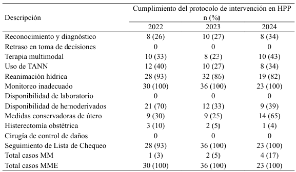 Tabla 3 Cumplimiento del protocolo de intervención en hemorragia posparto, 2022-2024