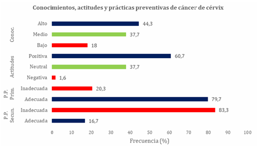 P.P. Secun.: Prácticas preventivas secundarias, P.P. Prim.: Prácticas preventivas primarias, Conoc.: Conocimientos.