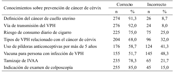 Los conocimientos de las madres de estudiantes de Obstetricia sobre prevención del cáncer de cérvix fueron de nivel alto en 44,3 % (n = 133) (Figura 1). El 41,3 % (n = 124) no tiene conocimiento sobre el riesgo del uso prolongado de píldoras anticonceptivas y 48,3 % (n = 145) desconoce que una persona infectada con VPH puede recibir la vacuna contra este virus (Tabla 1).