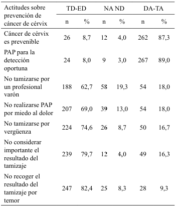 La actitud predominante sobre prevención del cáncer de cérvix en las madres fue positiva 60,7 % (n = 182) (Figura 1). Los aspectos en los que las madres estuvieron en mayor acuerdo fueron: el cáncer de cérvix es prevenible y la prueba de Papanicolaou permite detectar el cáncer de cérvix de forma oportuna (Tabla 2).