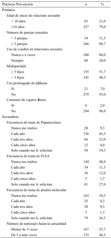 Respecto a las prácticas preventivas primarias de cáncer de cérvix en mayor frecuencia fue adecuada 79,7 % (n = 239). Se identificó que el 80 % (n = 240) nunca o a veces utiliza preservativo en las relaciones sexuales, el 2 % (n = 6) consume cigarrillo de forma diaria. En las prácticas preventivas secundarias principalmente fueron inadecuadas en el 83,3 % (n = 250). Menos de la mitad (45,3 %, n = 136) se realizó la prueba de Papanicolaou de forma anual, el 48 % (n = 144) nunca se realizó la prueba de IVAA, el 54,3 % (n = 163) nunca se hizo la prueba molecular del VPH (Figura 1 y tabla 3).