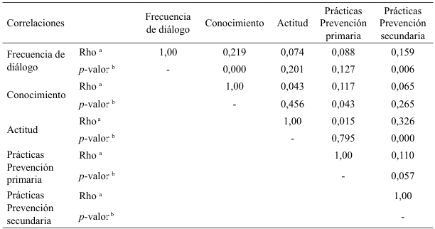 La frecuencia del diálogo entre madre-estudiante sobre prevención del cáncer de cérvix se relaciona de forma directa con los conocimientos (rho = 0,219; p < 0,01) y las prácticas preventivas secundarias (rho = 0,159; p = 0,006). Se observó una relación directa entre los conocimientos y prácticas preventivas primarias (rho = 0,117; p = 0,043). La actitud se relaciona de forma directa con las prácticas secundarias de prevención de cáncer de cérvix (rho = 0,326; p < 0,01).