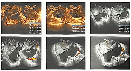 La paciente acudió con un cuadro de cuatro semanas de dolor pélvico constante, exacerbado con la bipedestación, sin flujo ni sangrado, y con sensación de inflamación pélvica. Al final de la cuarta semana, el dolor se intensificó irradiándose a la región umbilical. Durante la ultrasonografía pélvica ginecológica transvaginal (Figura 1), el ovario derecho mostró una apariencia anormal, reemplazado por una lesión multiloculada con más de 10 lóculos. La estructura sólido-quística de la lesión tenía un componente sólido que representaba aproximadamente el 70 % del tumor. Las proyecciones de la masa y el contorno de la lesión eran irregulares. El doppler color identificó una puntuación IOTA (International Ovarian Tumor Analysis) nivel III-IV, indicando una alta vascularización de la lesión. Las medidas del tumor fueron 133,1 x 117,9 x 139,2 mm, con un volumen de 1143,41 cm³. La clasificación O-RADS 5 (Ovarian Adnexal Imaging-Reporting-Data System) sugirió un alto riesgo de malignidad. Adicionalmente, se detectó líquido libre en el fondo de saco posterior, superior al útero y la lesión, consistente con ascitis.