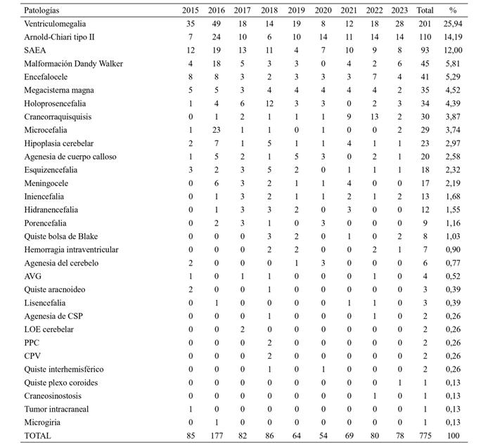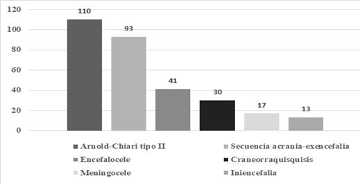 El primer hallazgo, en frecuencia, fueron los defectos del tubo neural (DTN), que incluyen la malformación de Arnold-Chiari tipo II, la secuencia acrania-exencefalia-anencefalia, encefalocele y sus variantes según su localización, craneorraquisquisis, iniencefalia y el meningocele, representaron 304 casos, constituyendo el 39,22 % de todos los casos de malformación congénita del SNC. La malformación de Arnold Chiari tipo II, con 110 casos (14,19 %) fue la más frecuente, seguida por la secuencia acrania- exencefalia-anencefalia con 93 (12 %) (Grafico 1).
