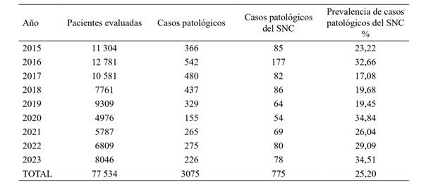 Entre las 3075 malformaciones diagnosticadas, 775 casos correspondieron a malformaciones del SNC, con una prevalencia general de 25,20 % de todas las malformaciones diagnosticadas en el periodo de 9 años. La distribución de los casos por año se presenta en la tabla 1. El mayor número de estudios se realizó en 2016 con 12 781 estudios, de los cuales fueron casos patológicos del SNC 177 (32,66 %). La mayor prevalencia correspondió al año 2020 (34,84 %).