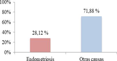 Se evidenció entonces que la infertilidad fue mayor entre las pacientes con endometriosis en comparación con aquellas que no tenían la enfermedad, con 97,83 % (45/46) y 87,12 % (115/132), respectivamente, identificándose un riesgo de 6,65 veces mayor para infertilidad en la endometriosis. Este hallazgo fue significativo desde el punto de vista estadístico (p < 0,05) (tabla 4). De las 223 pacientes atendidas en la consulta de fertilidad en el periodo de estudio, 160 eran infértiles, observándose que, entre estas, el 28,12 % (45/160) tenía diagnóstico de endometriosis (grafica 1).