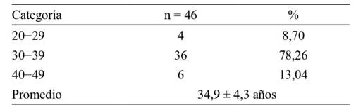 Del total de 223 pacientes atendidas en la consulta de la clínica de fertilidad estudiada, durante el periodo comprendido entre enero y diciembre de 2020, 46 tenían diagnóstico de endometriosis, para una prevalencia de 20,63 %, predominando las mujeres con 30−39 años, con un 78,26 %. El promedio general fue de 34,9 años, y la desviación estándar de ± 4,3 años (tabla 1).