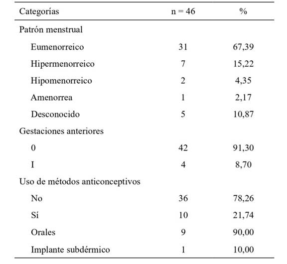 Se observó que el 67,39 % de las pacientes con endometriosis tenía un patrón menstrual eumenorreico, Así mismo, el 91,30 % no tenía gestaciones anteriores y el 78,26 % de las pacientes no usaba métodos anticonceptivos (tabla 2).