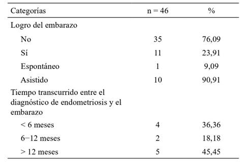 De las pacientes que asistieron a la consulta de fertilidad, solo el 23,91 % (11/46) logró el embarazo. De estas, el 90,91 % (10/11) fue asistido. Al evaluar el tiempo transcurrido entre el diagnóstico de endometriosis y el embarazo actual, el 45,45 % (5/11) se ubicó en más de 12 meses, con un promedio general de 19,9 meses, y una desviación estándar de ± 27,5 meses (tabla 3).