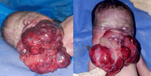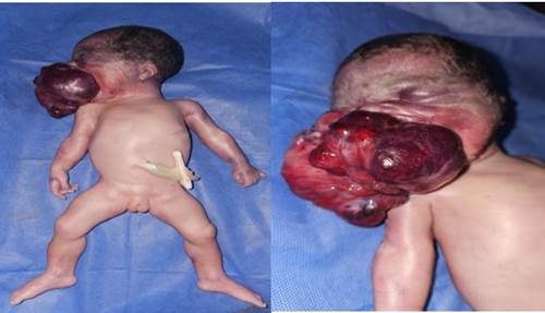 En un 90 % de los casos, se observa la presencia de un tumor lobulado, sólido quístico, con calcificaciones en su interior que se proyecta desde la frente, cara o cuello, y puede asociarse a otras malformaciones congénitas: anoftalmia, displasia renal bilateral, meningoencefalocele, síndrome de Pierre Robin, hipoplasia de cuerpo calloso, entre otros. Dichas pruebas permiten conocer mejor las características y composición de la masa, si hay infiltración presente o ausente, la relación con estructuras adyacentes y orientar su origen. De esta manera se puede estimar la necesidad de un EXIT (ex-utero intrapartum treatment), o planificar la cirugía de resección posterior 7,9,10.