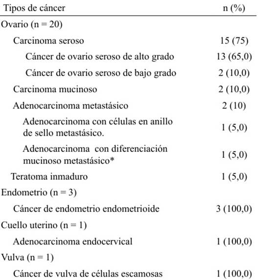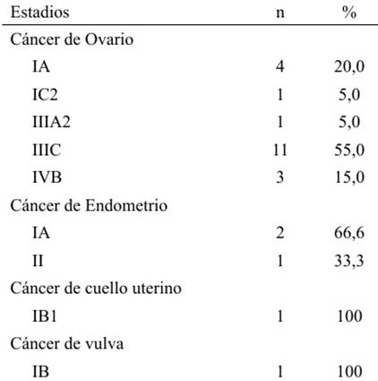 El estadio del tumor según el tipo de cáncer, se presenta en la Tabla 6. Entre los cánceres de ovario, la mayor frecuencia fue de estadio IIIC (11 pacientes, 55 %). Dos de las neoplasias endometriales eran estadio IA y el tercer caso era estadio II; el cáncer de cuello uterino era estadio IB1 y el de vulva IB.