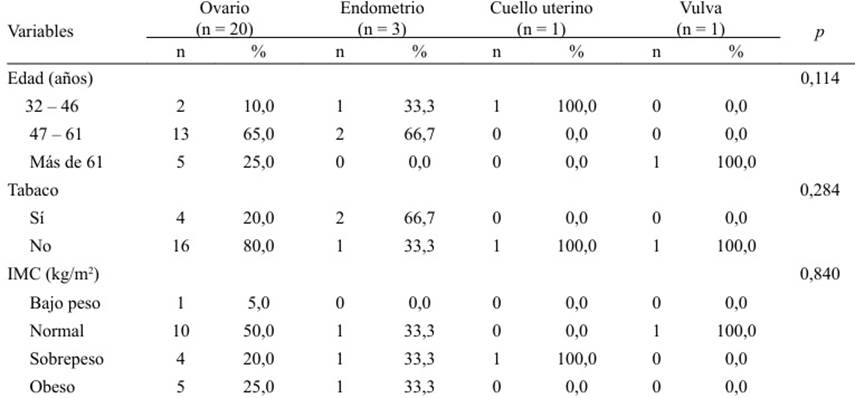 Las variables epidemiológicas según el tipo de cáncer se presentan en la Tabla 2. No hubo diferencias en la edad (p = 0,114), el hábito tabáquico (p = 0,284), ni en el índice de masa corporal (IMC) (p = 0,840), según el órgano afectado. Las lesiones de ovario (65 %) y endometrio (66,7 %), predominaron en las mujeres entre 47 y 61 años. La paciente con cáncer de cuello uterino tenía entre 32 y 46 años y la que tenía diagnóstico de cáncer de vulva tenía más de 61 años. Con relación al hábito tabáquico, solo estuvo presente en 6 casos (24 %); 4 (20 %) pacientes con cáncer de ovario y 2 (66,7 %) con cáncer de endometrio. El índice de masa corporal (IMC) fue normal en 10 mujeres con cáncer de ovario (50 %), 1 (33,3 %) con cáncer de endometrio y 1 (100 %) con cáncer de vulva. La única paciente con cáncer de cuello uterino tenía sobrepeso.