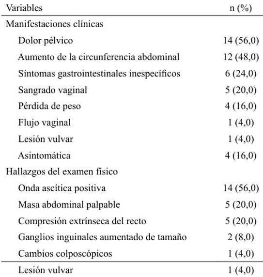 Con relación al examen clínico, predominaron signos típicos del cáncer de ovario: onda ascítica positiva (14 pacientes, 56 %), masa abdominal palpable (5 pacientes, 20 %), compresión extrínseca del recto (5 casos, 20 %).