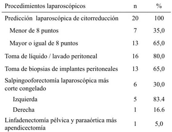 En la Tabla 4 se presentan los procedimientos laparoscópicos realizados en las pacientes con cáncer de ovario. En 20 casos (100 %) se estableció la predicción laparoscópica de citorreducción: 7 pacientes (35 %) tenían menos de 8 puntos y 13 pacientes (65 %) tenían 8 puntos o más. Se realizó toma de líquido y/o lavado peritoneal en 16 pacientes (80 %), biopsias de implantes peritoneales en 13 (65 %), salpingooforectomía laparoscópica más corte congelado en 6 casos (30 %) y linfadenectomía pélvica y paraaórtica más apendicectomía en una única paciente (5 %).