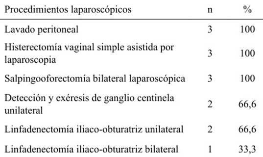A todas las pacientes con adenocarcinoma de endometrio se les practicó histerectomía vaginal simple asistida por laparosopcopia, salpingooforectomía bilateral laparoscópica y lavado peritoneal. En dos casos (66,6 %) se practicó detección y exéresis de ganglio centinela unilateral y linfadenectomía iliaco-obturatriz unilateral. En un caso (33,3 %) la linfadenectomía iliaco-obturatriz fue bilateral (Tabla 5).